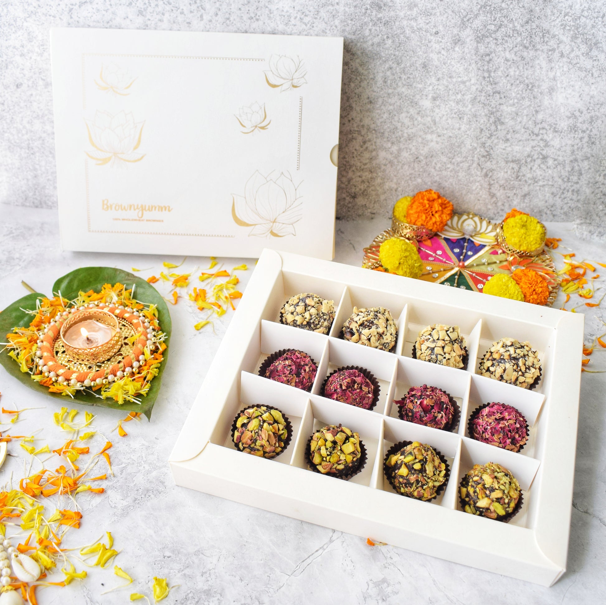 100 % Wholewheat Fusion Eggless Brownie Truffles in 3 unique flavors- Ferrero, Gulkand filled Paan and Pista Thandai in an elegant White and Gold Box